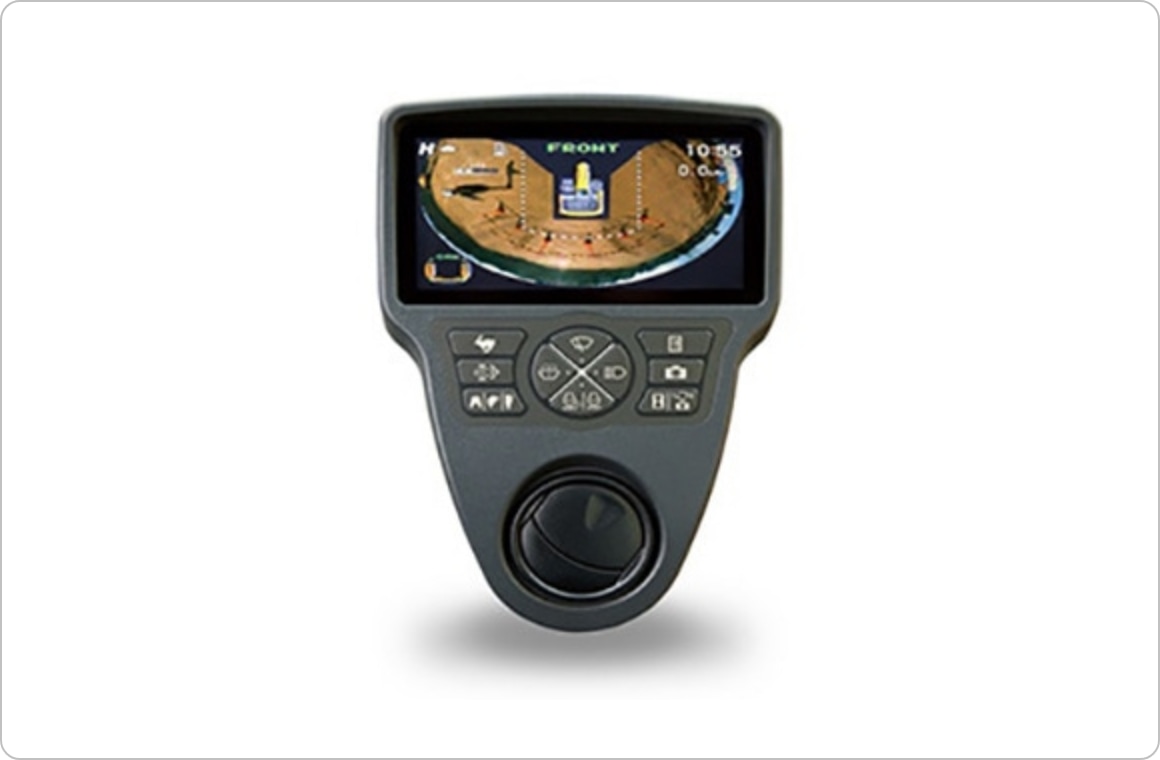 大型重機のための周囲確認支援システムであり、3つのカメラからの映像をシームレスにつなぎ、操縦者が直感的に理解できる視覚情報を提供できる。近年では乗用車などでも一般的になりつつある技術だが、こうした大型重機では乗用車以上に安全性向上の効果を期待できると考える。モニタと一体化した操作インタフェースもシンプルで使いやすく、ピラー部に取り付けることで視界を邪魔しないものとなっている。