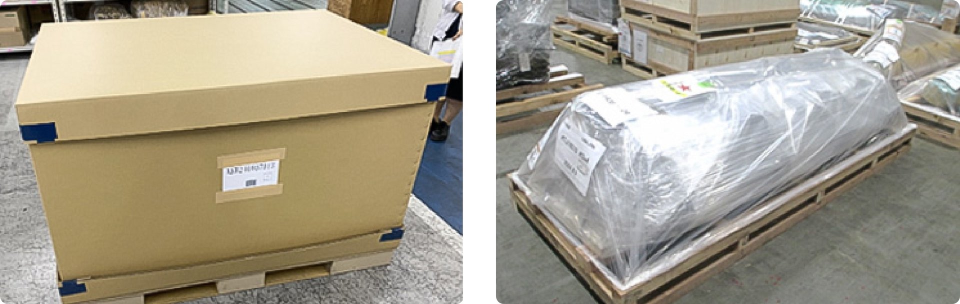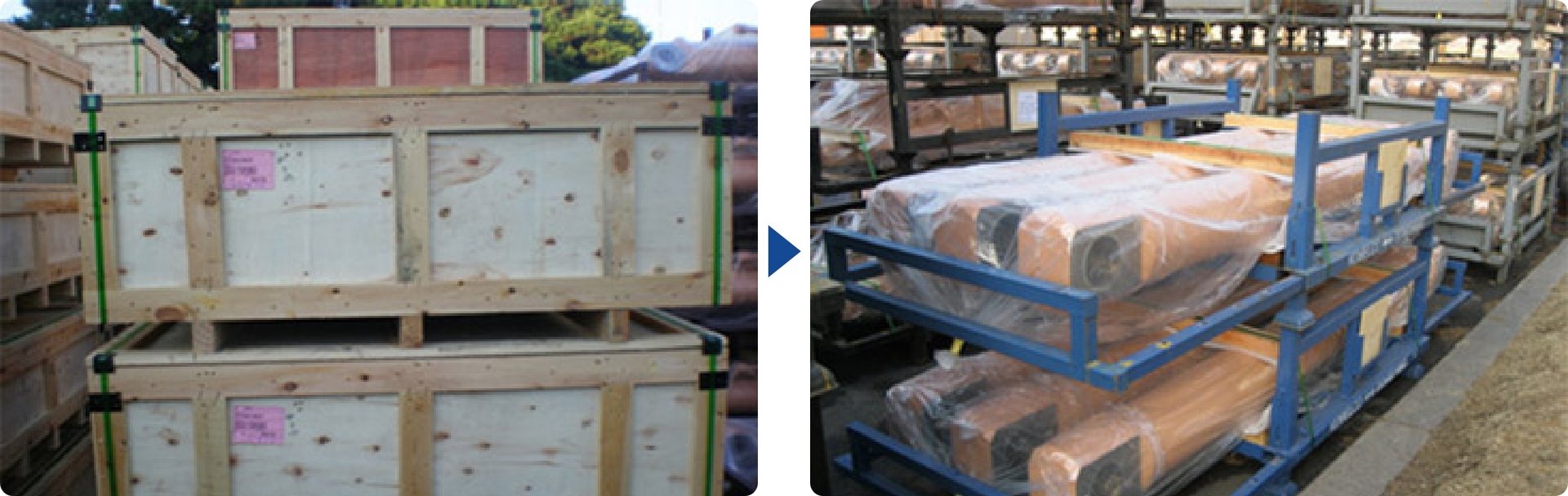 「海外工場へ部品出荷木材から強化段ボール・簡易化」梱包木材削減梱包