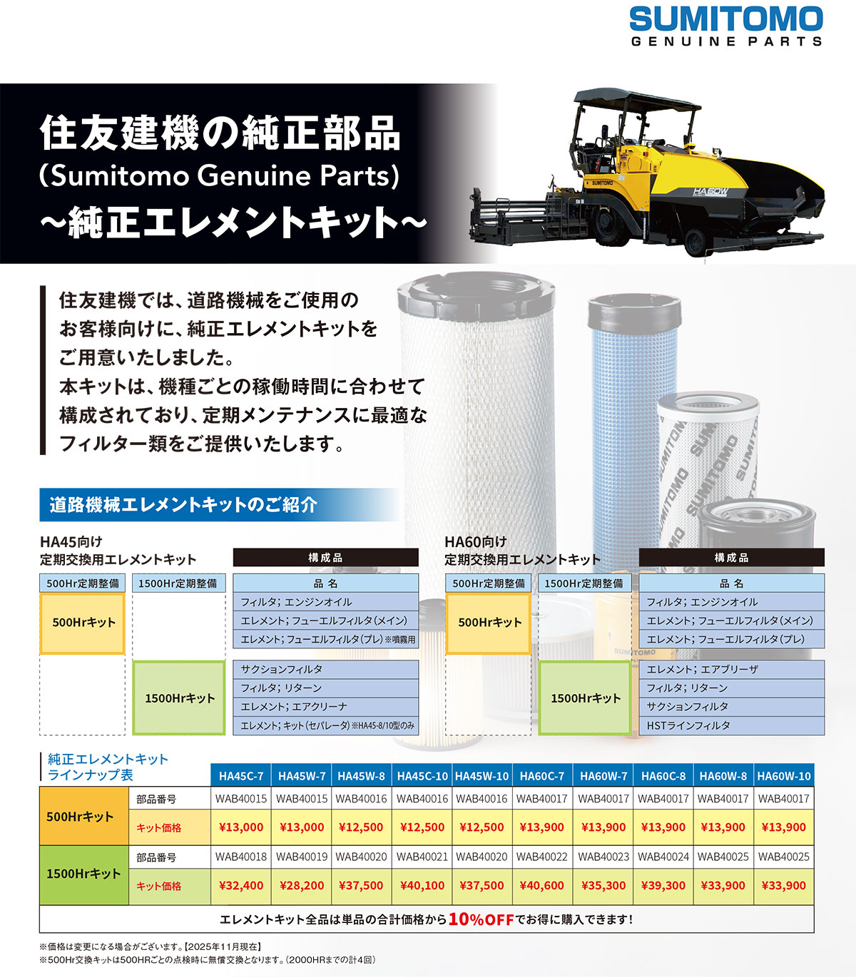 住友建機では、道路機械をご使用のお客様向けに、純正エレメントキットをご用意いたしました。本キットは、機種ごとの稼働時間に合わせて構成されており、定期メンテナンスに最適なフィルター類をご提供いたします。